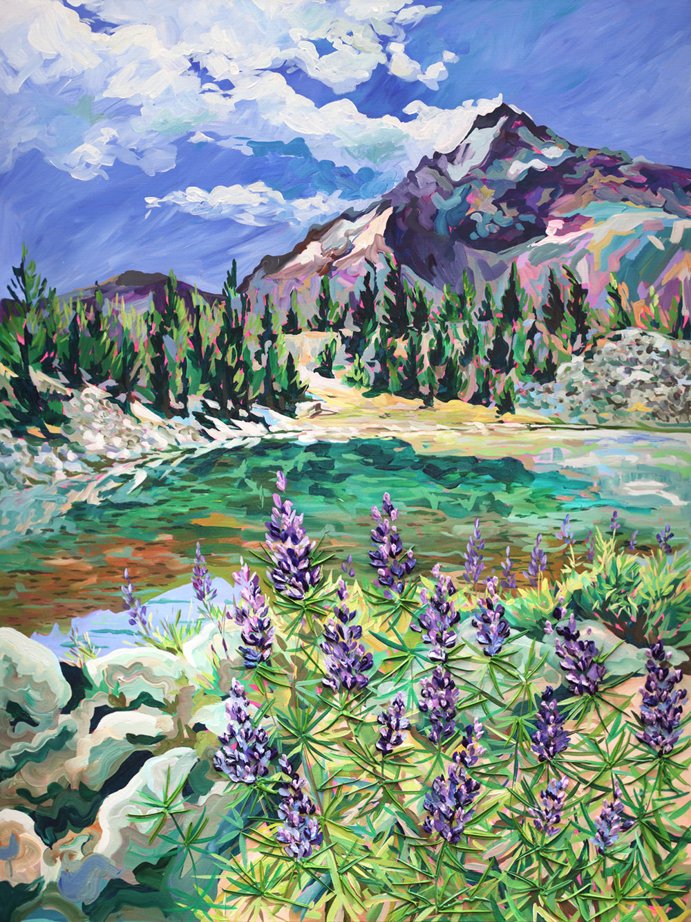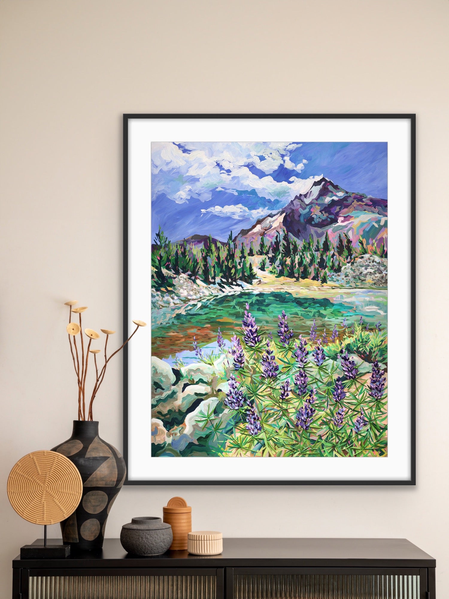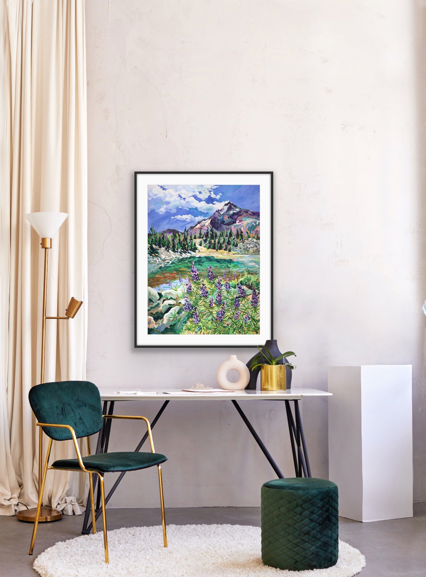 "This is a print of my painting titled 'High Tarn at Broken Top' featuring a beautiful mountain lake at Broken Top Mountain in Oregon. Lupine wildflowers grow along the water creating an idyllic scene." -Anisa
