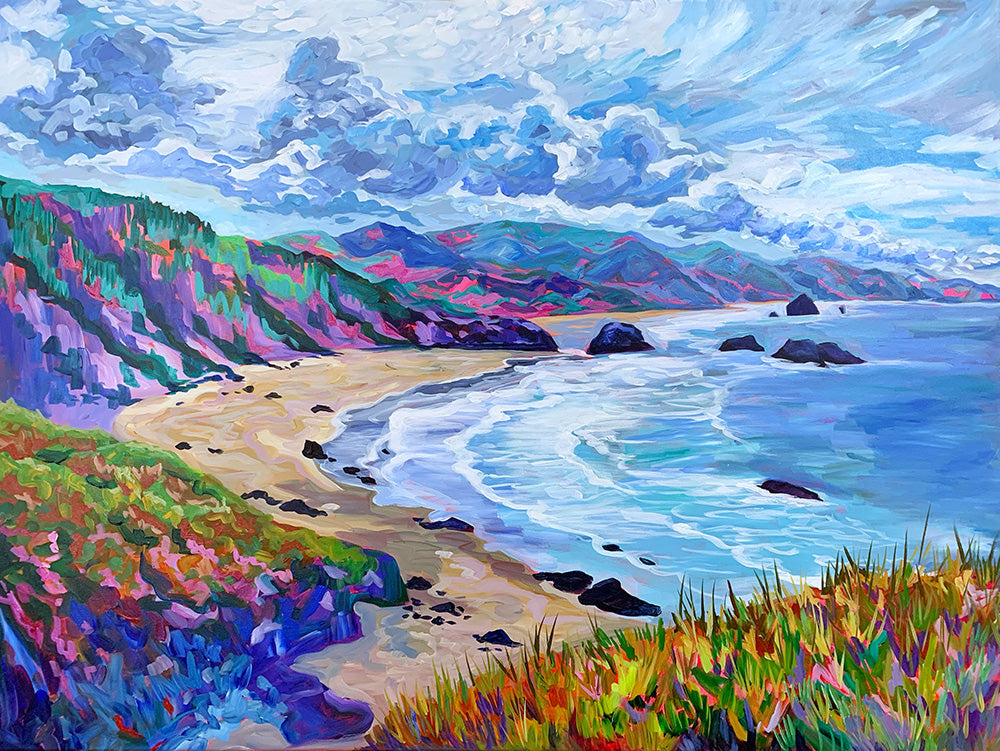 "This is a print of my painting titled 'Oregon Kaleidoscope Coast' featuring the beautiful view of Indian Beach in Ecola State Park. I love seeing the rumbling clouds over the oregon coast." -Anisa