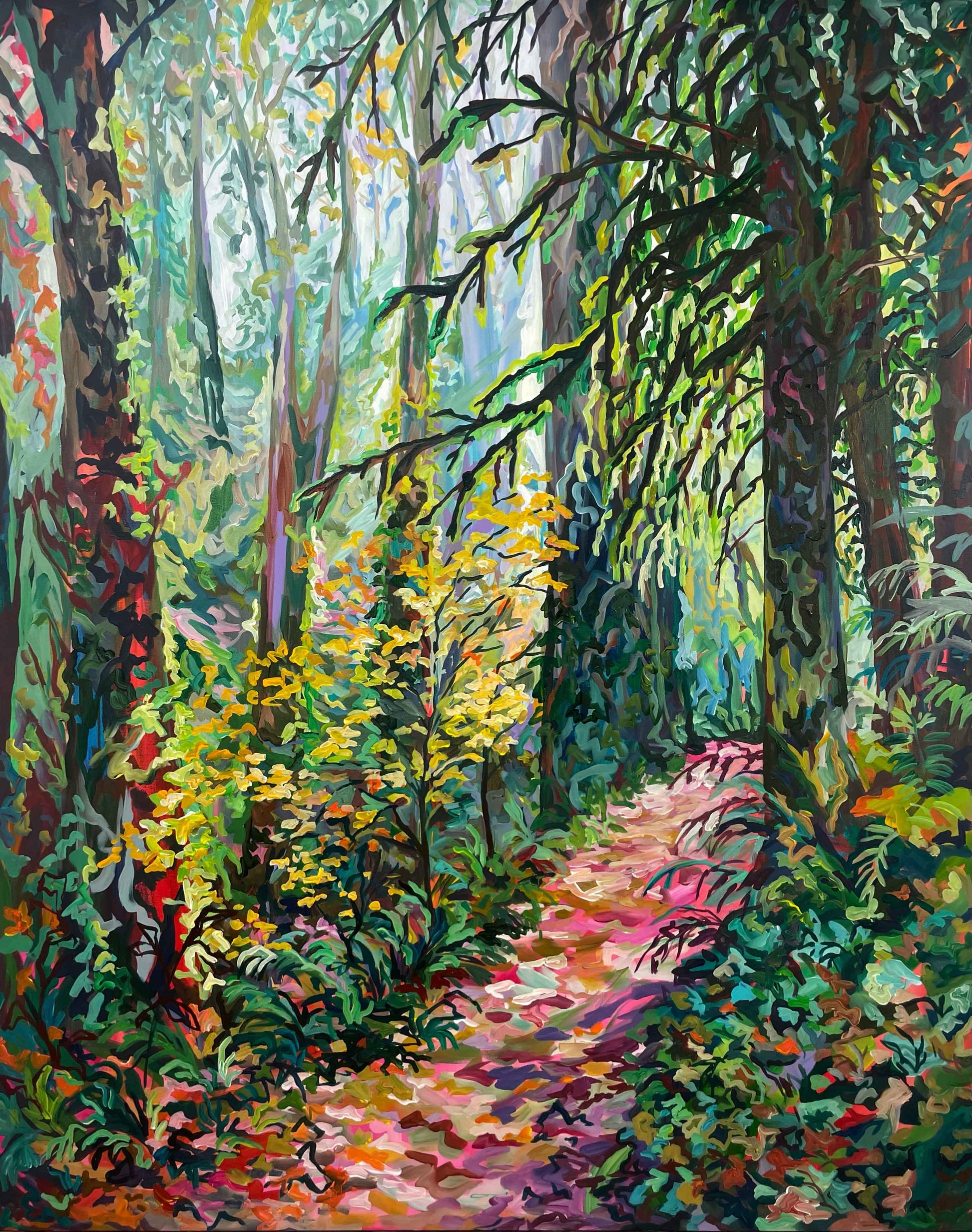 "This is a print of my painting titled 'Remembering Color on Cloudy Days.' I created this painting during the cold, dark, Portland winter which is always tests my mental health. In the studio I wanted to create an image of hope and nostalgia for the local forest I love to walk in when it is full of greenery and life!" -Anisa